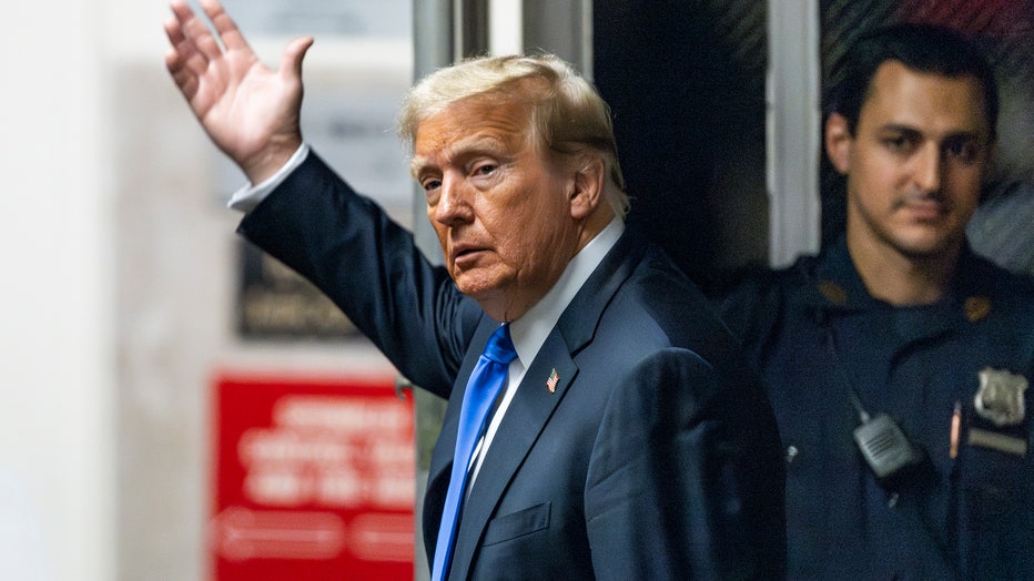 Former U.S. President Donald Trump gestures to the media as he arrives to the courthouse as the jury is scheduled to continue deliberations for his hush money trial at Manhattan Criminal Court on May 30, 2024 in New York City. (Photo by Justin Lane -