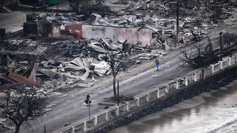An aerial image taken on August 10, 2023 shows a person walking down Front Street past destroyed buildings burned to the ground in Lahaina in the aftermath of wildfires in western Maui, Hawaii. (PATRICK T. FALLON/AFP via Getty Images)