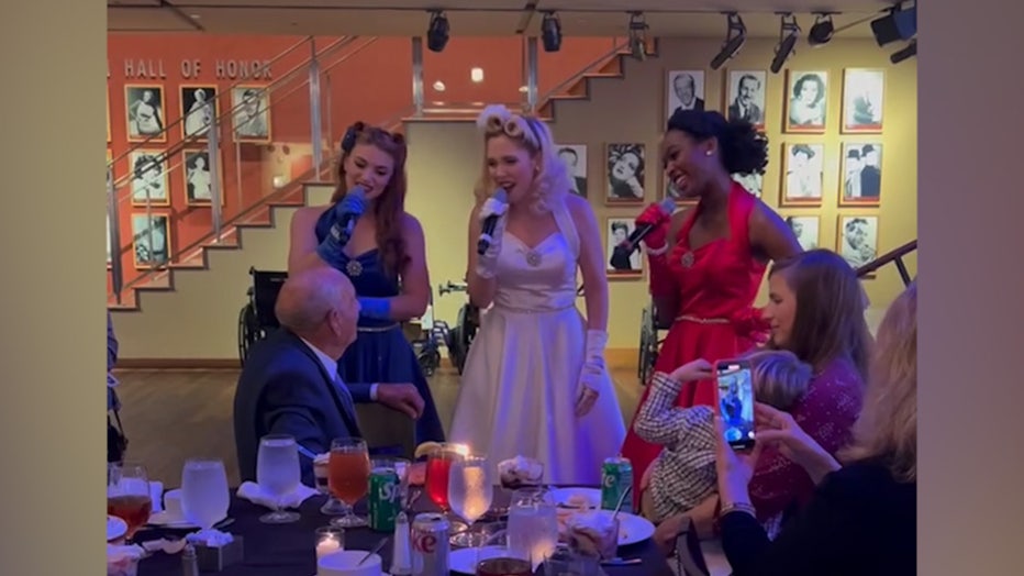 Victory Belles sing "Happy Birthday" to World War II veteran Joseph Eskenazi during his 105th birthday celebration.  (The National WWII Museum)