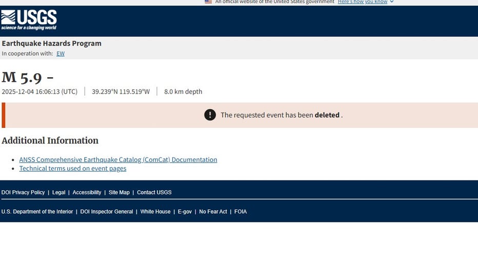 DAYTON, Nev. - The U.S. Geological Survey sent out an erroneous alert on Thursday, stating originally that an earthquake with a magnitude of 5.9 struck in Nevada, but then pulled that alert back, saying it was a mistake.