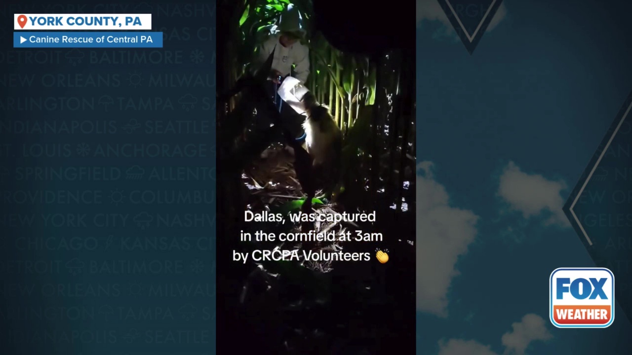 Footage shows the moment Canine Rescue of Central PA volunteers captured Dallas Cheddar, a stray pup with her head trapped inside a plastic jar, in a cornfield in York County, Pennsylvania, early Wednesday morning.