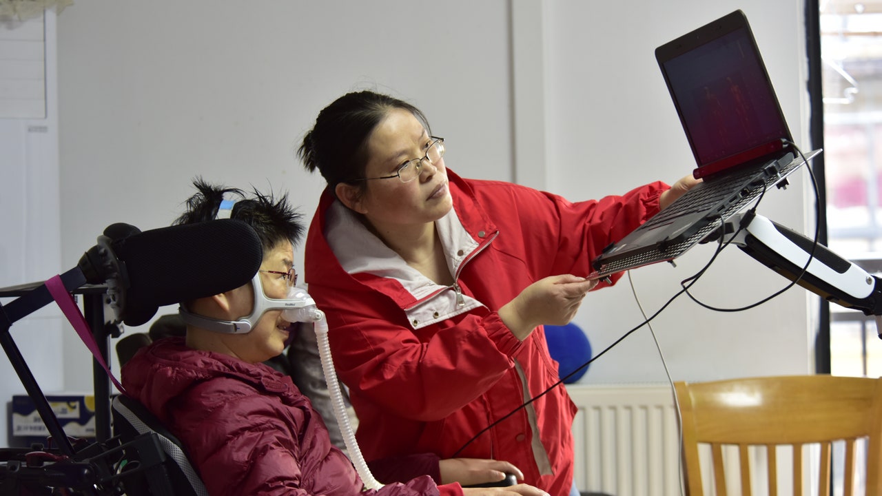 An ALS patient wears a ventilator at home and uses an eye-control device to write an article to communicate with her patients via livestream. (CFOTO/Future Publishing via Getty Images)