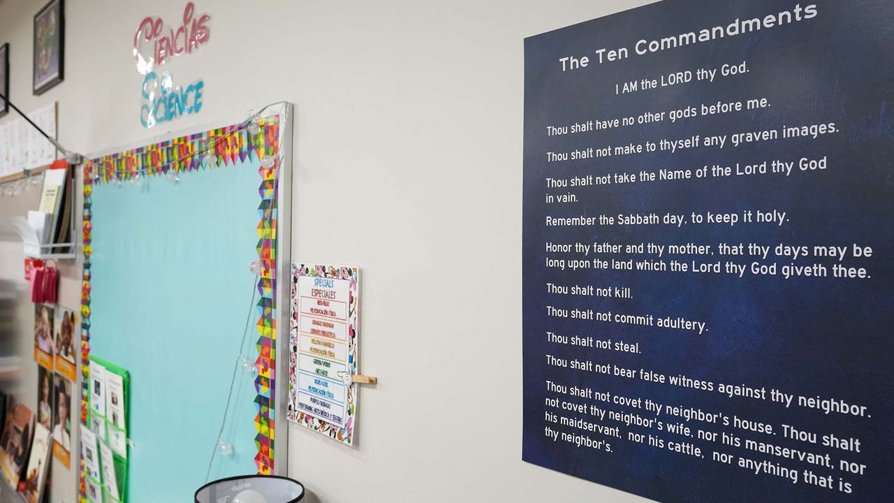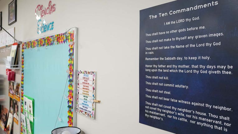 FILE - A copy of the Ten Commandments is displayed in a classroom at Bagdad Elementary School in Leander, Texas, on Wednesday, Nov. 19, 2025. (Jay Janner/The Austin American-Statesman via Getty Images)