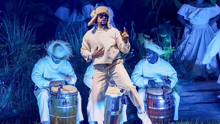 Bad Bunny performs onstage during Night One of Bad Bunny: "No Me Quiero Ir De Aqui" Residencia En El Choli at Coliseo de Puerto Rico José Miguel Agrelot on July 11, 2025 in San Juan, Puerto Rico. (Photo by Kevin Mazur/Getty Images)