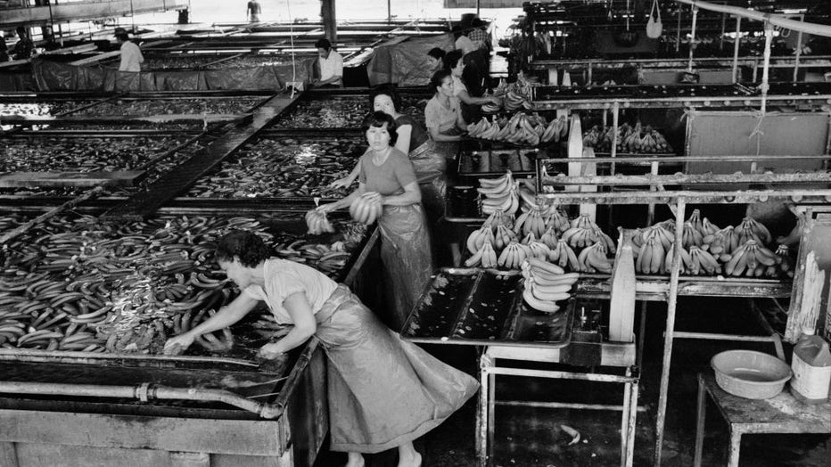 FILE - Elevated view of workers at an unspecified fruit company as they sort Cavendish bananas from a fresh-water holding tank and move them to a conveyor belt, northeast Honduras, October 1982. (Photo by Robert Nickelsberg/Getty Images)