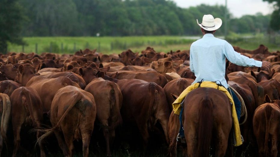 A ranch hand rounds up cattle at the Adams Ranch Inc. in St. Lucie County, Florida, on July 9, 2013. (Ty Wright/Bloomberg / Getty Images)