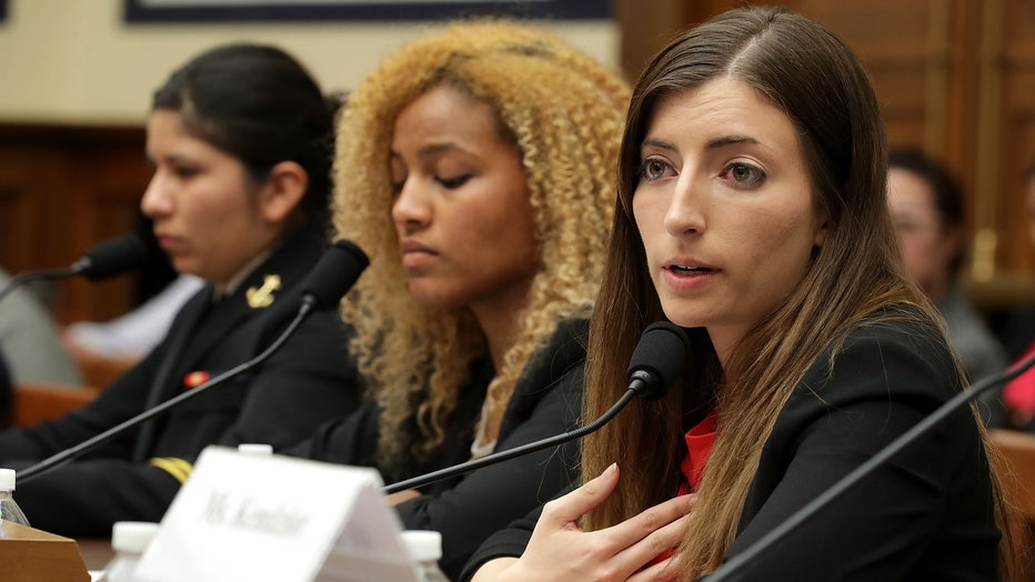 Former U.S. Military Academy Cadet Stephanie Gross (R), a survivor of sexual assault, testifies before the House Armed Services Committee's Subcommittee on Military Personnel with Naval Academy Midshipman Second Class Shiela Craine (L) and Ariana Bul
