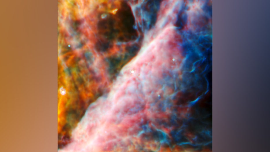 This image from Webb’s MIRI (Mid-Infrared Instrument) shows a small region of the Orion Nebula. At the center of this view is a young star system with a protoplanetary disk named d203-506. An international team of astronomers detected a new carbon mo ( ESA/Webb, NASA, CSA, M. Zamani (ESA/Webb), and the PDRs4All ERS Team)