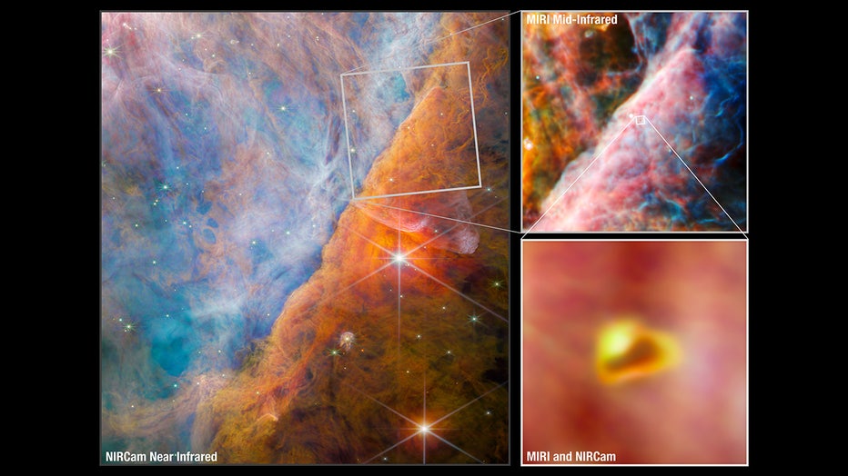 These Webb images show a part of the Orion Nebula known as the Orion Bar. The largest image, on the left, is from Webb’s NIRCam (Near-Infrared Camera) instrument. At upper right, the telescope is focused on a smaller area using Webb’s MIRI (Mid-Infra (ESA/Webb, NASA, CSA, M. Zamani (ESA/Webb), and the PDRs4All ERS Team)