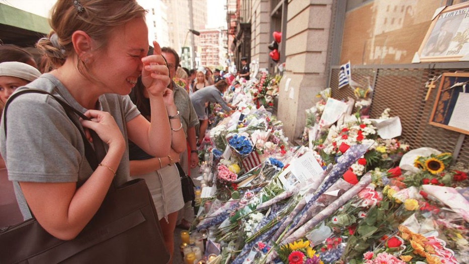 Crying woman among mourners paying respects at floral shrine outside loft bldg. where John F. Kennedy Jr. & wife Carolyn lived in public outpouring of grief after their death in plane crash along w. her sister Lauren Bessette. (Photo by Allan