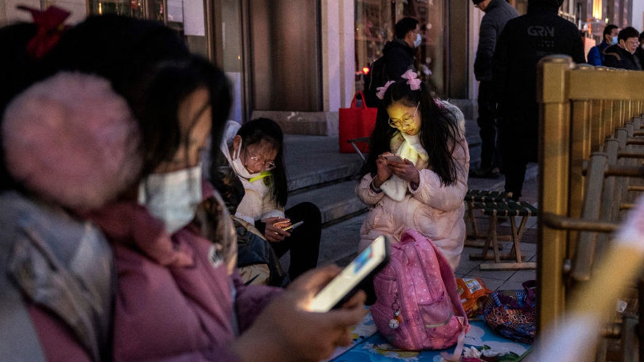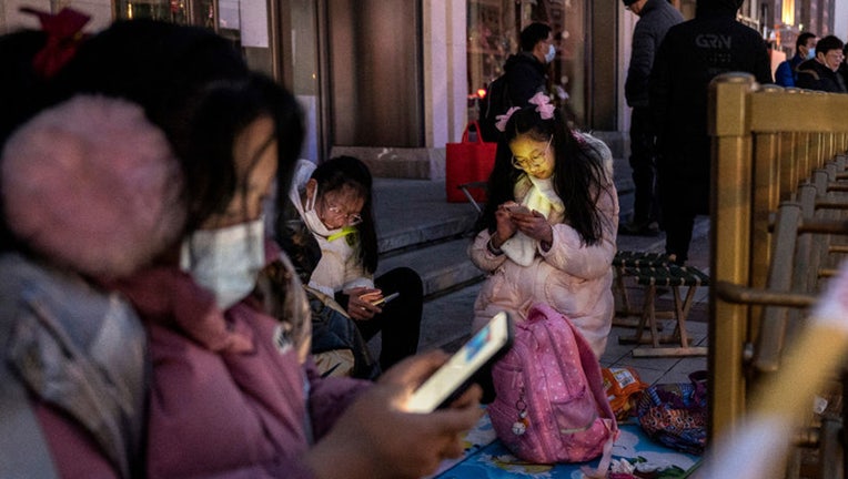 FILE - A girl looks at her phone as she and others wait in line overnight outside the official Beijing 2022 Winter Olympics flagship souvenir store early on Feb. 10, 2022, in Beijing, China. (Kevin Frayer/Getty Images)