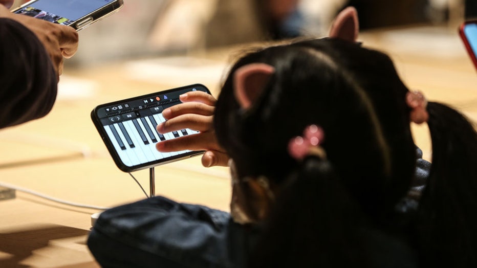 FILE - A child plays a piano application on an iPhone inside a new Apple store at Wuhan International Plaza on May 21, 2022, in Wuhan, Hubei Province of China.  (VCG/VCG via Getty Images)