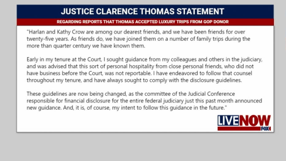 Thomas, the longest-serving member of the court, said he has always tried to comply with disclosure guidelines. Regarding those changes, "It is, of course, my intent to follow this guidance in the future," he said in the statement.