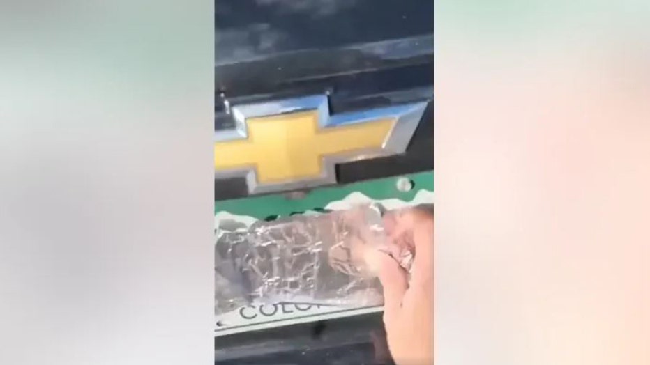 The employee peeled off aluminum foil covering the license plate before the thieves drove away. (Arapahoe County Sheriff’s Office / Fox News)