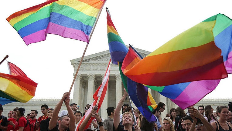 FILE-Supporters of same-sex marriage supporters hold flags outside the Supreme Court in Washington, DC. (Alex Wong/Getty Images)