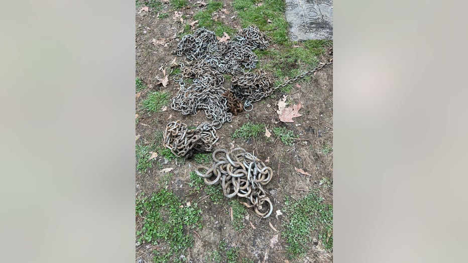 The animals were restrained with 20-plus pound chains, anchored to the ground by car axles. Investigators also found other items used to train the dogs.
