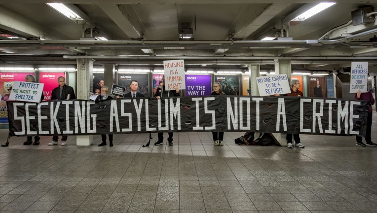 FILE-Protesters are seen holding a banner reading SEEKING ASYLUM IS NOT A CRIME at a demonstration at the Times Square Subway Station concourse in New York City. (Photo by Erik McGregor/LightRocket via Getty Images)