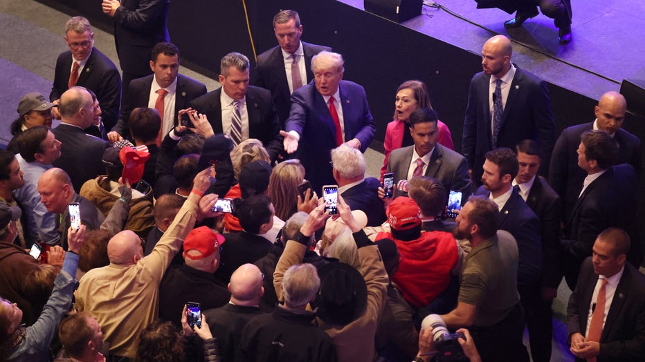 Former President Donald Trump greets guests following an event at the Adler Theatre on March 13, 2023 in Davenport, Iowa. (Photo by Scott Olson/Getty Images)