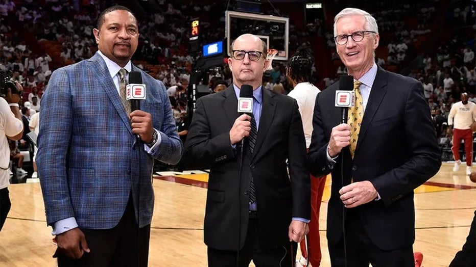 Jeff Van Gundy, center, joined ESPN in 2007 and became a mainstay of the network's NBA coverage before being let go this week. (David Dow/NBAE via Getty Images)