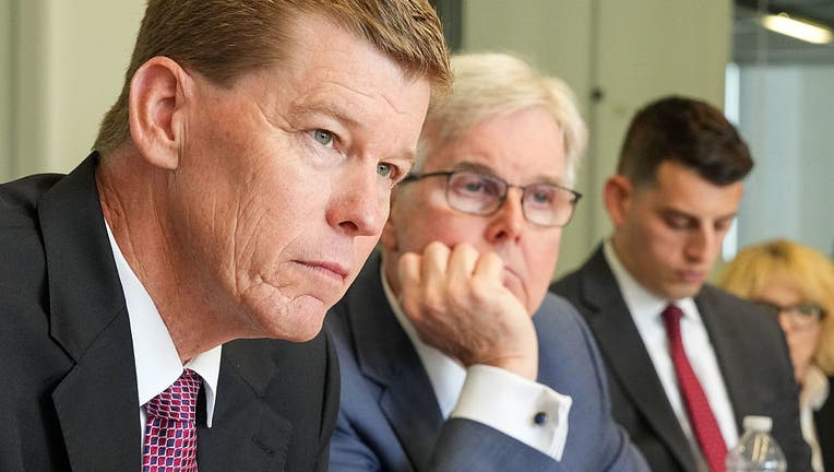 HOUSTON, TEXAS - JULY 23: Texas Division of Emergency Management Chief Nim Kidd, left, and Lt. Gov. Dan Patrick speak to members of the Houston Chronicle Editorial Board about the newspaper's coverage of Hurricane Beryl on Tuesday, July 23, 2024, at