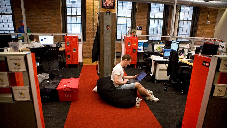 An employee sits on a beanbag in his cubicle as he works at Google's new offices in the Chelsea Market in New York City. (Photo by Ramin Talaie/Corbis via Getty Images)
