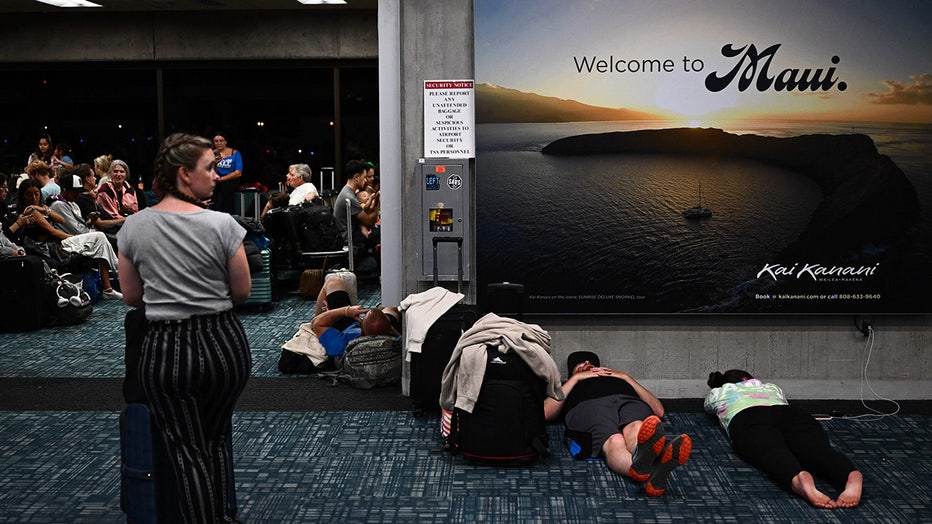 Passengers try to sleep below a "Welcome To Maui" billboard on the floor of the airport terminal while waiting for delayed and canceled flights off the island as thousands of passengers were stranded at the Kahului Airport. (Photo by PATRICK T. FALLO