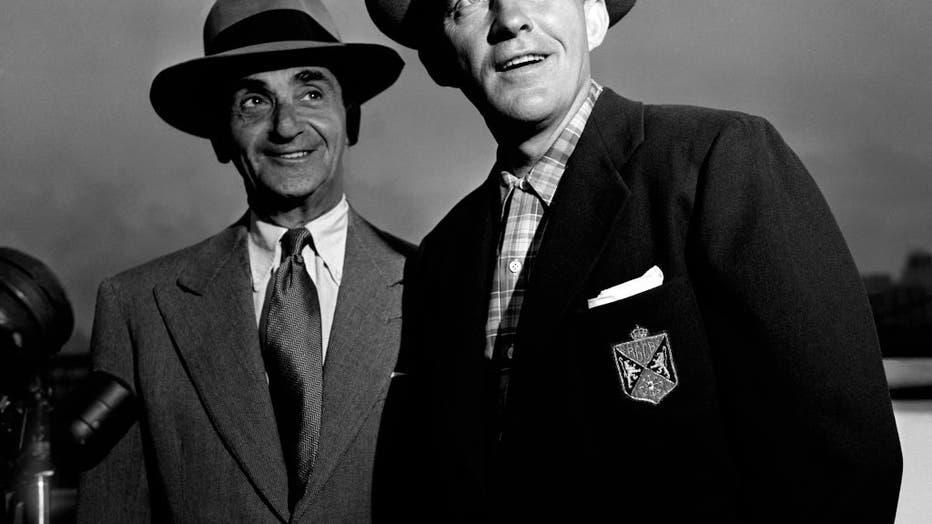 American composer, lyricist and songwriter Irving Berlin (1888-1989) and American singer, comedian and actor Bing Crosby (1903-1977) pose for a portrait on the RMS Queen Elizabeth while arriving from Europe on June 14, 1950 in New York, New York. (Ph