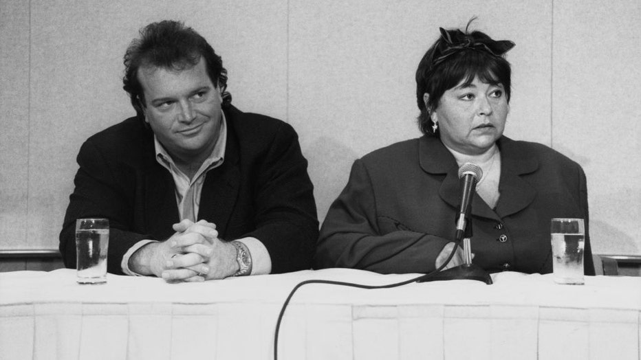 American actor and comedian Tom Arnold and his wife, American actress and comedian Roseanne Barr address a press conference in Los Angeles, California, July 1990. (Vinnie Zuffante/Michael Ochs Archives/Getty Images)