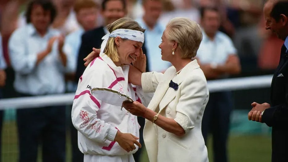 Czech tennis player Jana Novotna is consoled by British Royal Katharine, Duchess of Kent, after losing the women's singles final at the 1993 Wimbledon Championships, held at the All England Lawn Tennis and Croquet Club in London, England. (Henning Ba