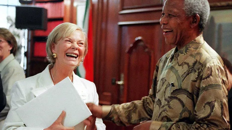 South African President Nelson Mandela meets Katharine, the Duchess of Kent, upon her arrival at the South African High Commission in London on June 15, 1998. (Michael Crabtree/AFP via Getty Images)