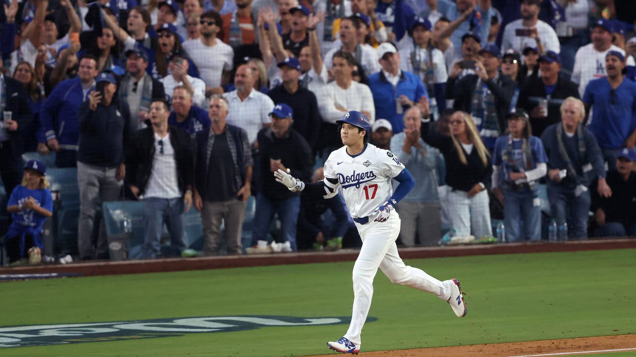 Shohei Ohtani #17 of the Los Angeles Dodgers tosses his bat after hitting a home run against the Toronto Blue Jays during the third inning in game three of the 2025 World Series at Dodger Stadium on October 27, 2025 in Los Angeles, California. (Credi