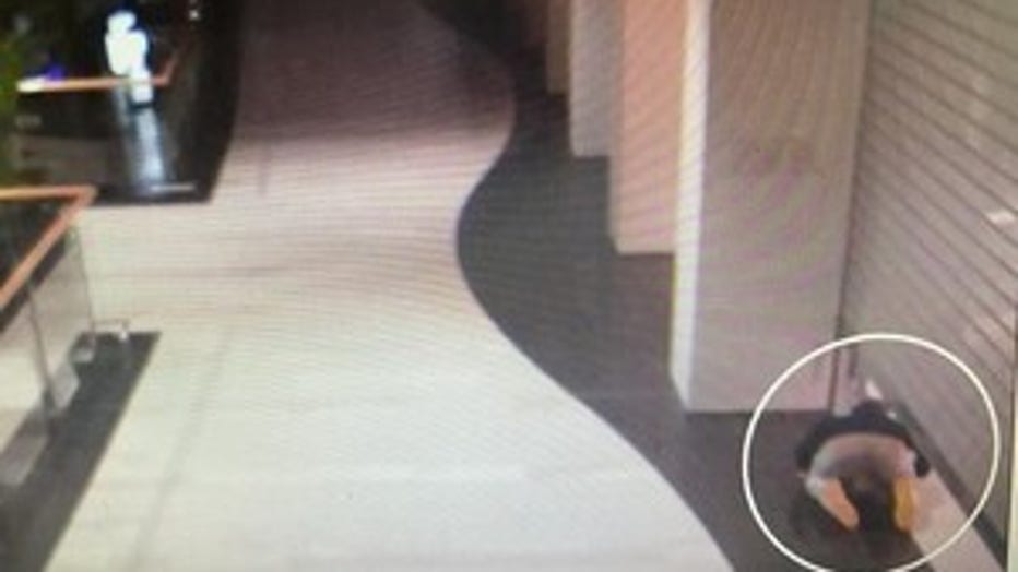The alleged thief attempts to crawl under a mall store door. (Poland Police/KRP/Śródmieście)