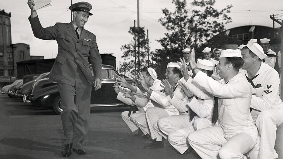 FILE - With papers placing him on the Navy's inactive list in hand, Chief Specialist Bob Feller, Cleveland Indian pitcher, finds plenty of volunteer catchers in case he decides to practice his pitching arm and toss away precious papers. (Getty Images)