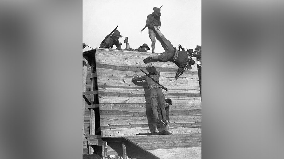 FILE - Soldiers find ingenious ways to scale wall during training at Camp Wadsworth, South Carolina, Calif. 1918.  (CORBIS/Corbis via Getty Images)