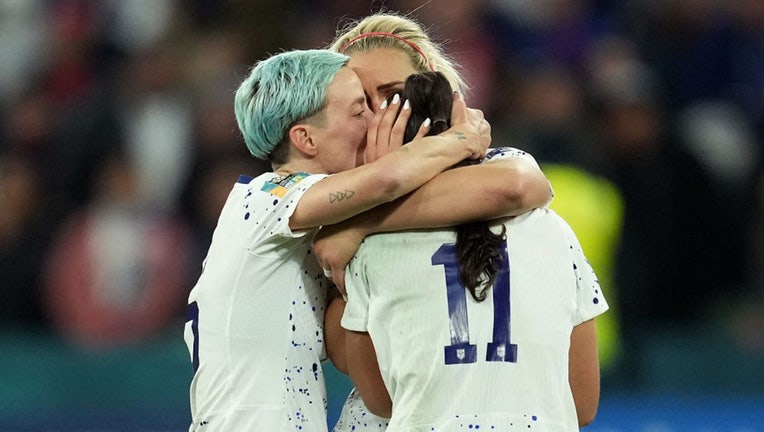 FILE - Lindsey Horan #10 of the United States hugs Megan Rapinoe #15 and Sophia Smith #11 after losing during the penalty kick shootout during the FIFA Women's World Cup Australia & New Zealand 2023 Round of 16 match between Sweden and the United (Robin Alam/USSF/Getty Images for USSF)