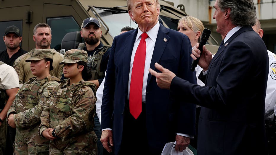 President Donald Trump stands with National Guard members and law enforcement officials during a visit to a security operation in Washington, D.C. (Photo by Anna Moneymaker/Getty Images)