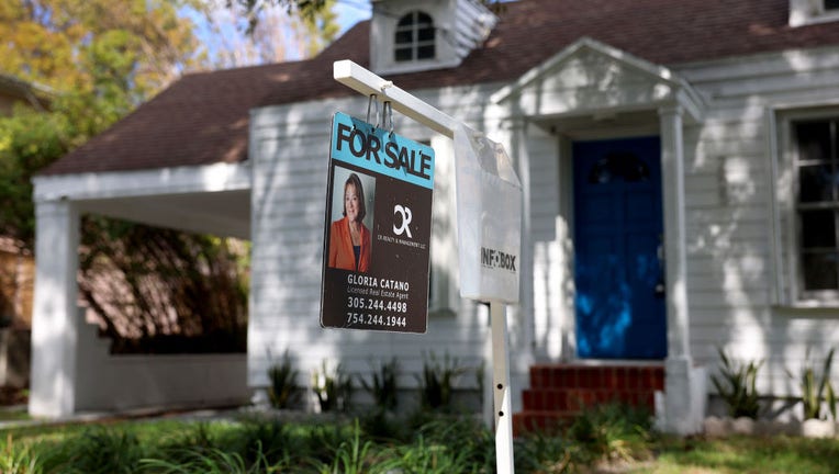 A For Sale sign displayed in front of a home on February 22, 2023 in Miami, Florida. (Photo by Joe Raedle/Getty Images)