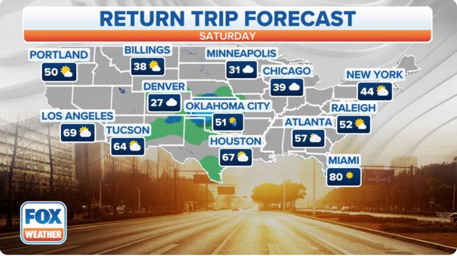 The return trip forecast on Saturday, November 25, 2023.(FOX Weather)