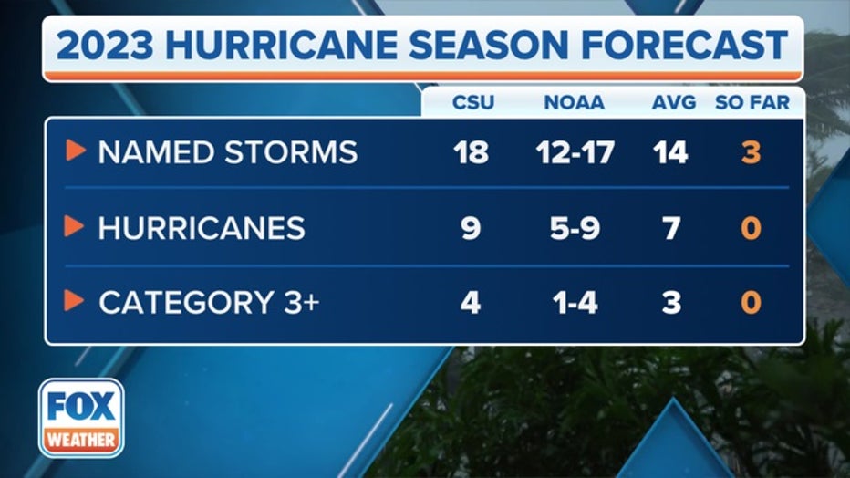 CSU's updated 2023 Atlantic hurricane season forecast compared to NOAA and the 30-year averages. (FOX Weather)
