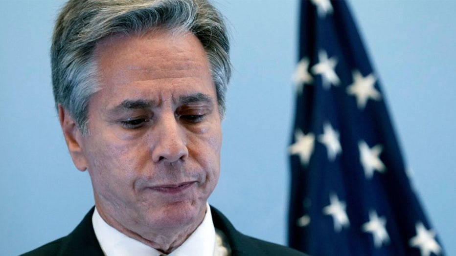 FILE - US Secretary of State Antony Blinken speaks during a press conference in Tel Aviv, on Oct. 12, 2023.  (JACQUELYN MARTIN/POOL/AFP via Getty Images)