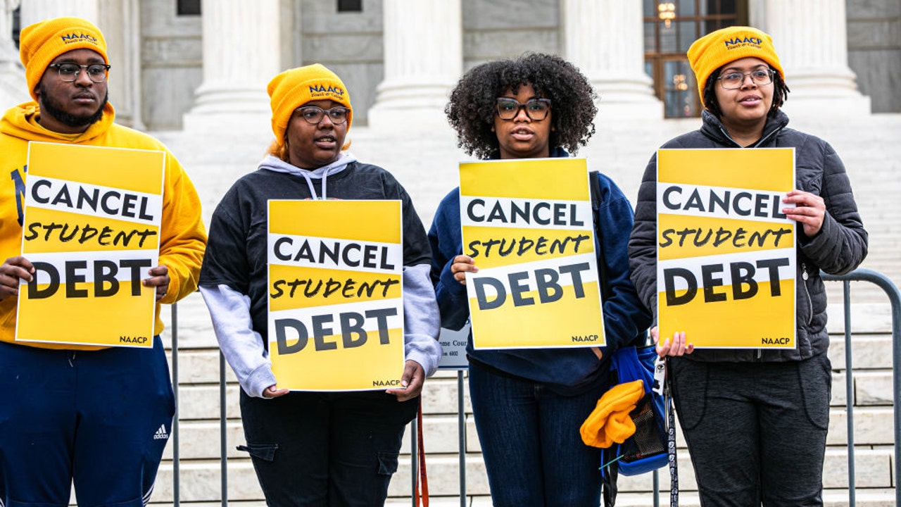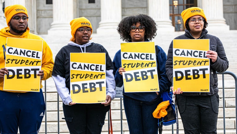 FILE-Demonstrators supporting cancelling student debt stand outside the Supreme Court in Washington, D.C. (Valerie Plesch/Bloomberg via Getty Images)