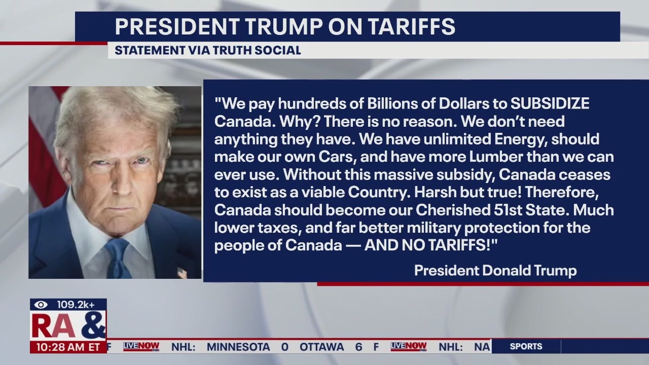 Trump contended that without that surplus, "Canada ceases to exist as a viable Country. Harsh but true! Therefore, Canada should become our Cherished 51st State. Much lower taxes, and far better military protection for the people of Canada — AND NO TARIFFS!"