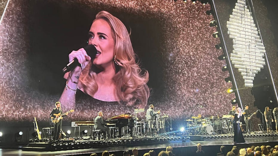 Adele on opening night of "Weekends With Adele" at the Colosseum at Caesars Palace on Friday, Nov. 18, 2022. (John Katsilometes/Las Vegas Review-Journal/Tribune News Service via Getty Images)