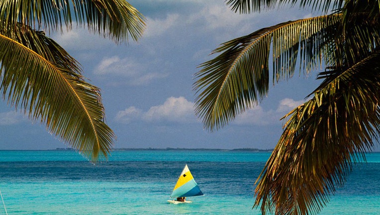 FILE-Image of palm trees along the coast and a sailboat at sea in the Bahamas. (Photo by DeAgostini/Getty Images)
