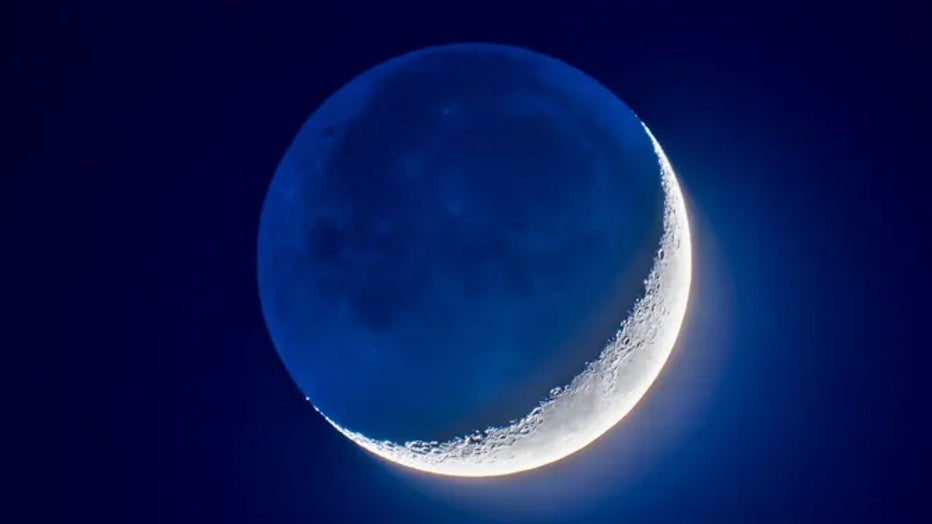 The 4-day-old waxing crescent Moon on April 8, 2019 in a blend of short and long exposures to bring out the faint Earthshine on the dark side of the Moon and deep blue twilight sky while retaining details in the bright sunlit crescent. (Alan Dyer/VWP