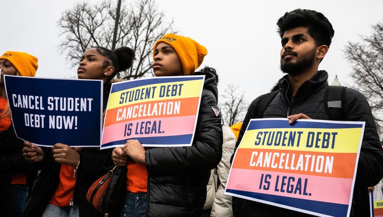 FILE-Demonstrators in favor of cancelling student debt outside the Supreme Court in Washington, D.C. on Tuesday, Feb. 28, 2023. (Valerie Plesch/Bloomberg via Getty Images)