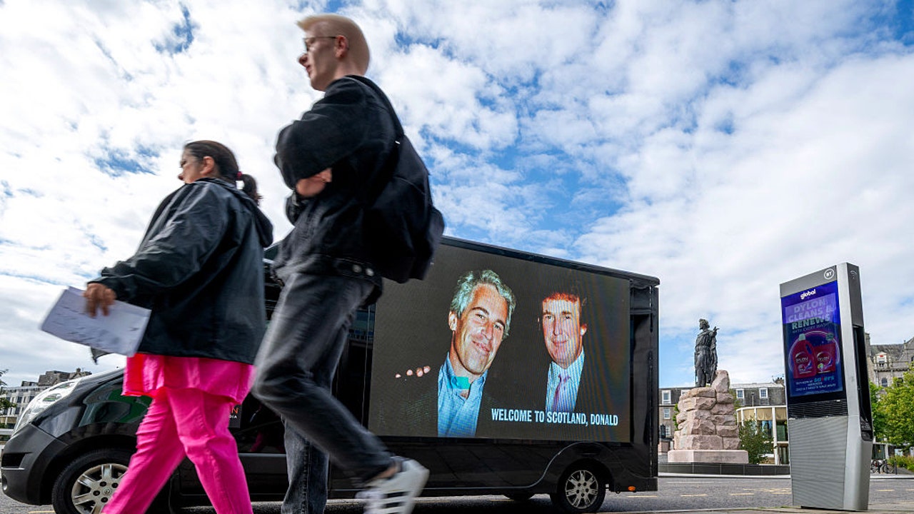 A photograph of US President Donald Trump and convicted child sex offender Jeffery Epstein is displayed on the side of a van in Aberdeen city centre, north east Scotland on July 28, 2025. (Photo by LESLEY MARTIN/POOL/AFP via Getty Images)