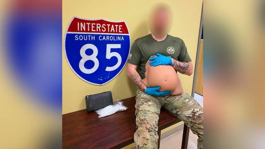 Two people were arrested and charged with drug-related crimes in South Carolina after authorities discovered cocaine was hidden inside a fake pregnant belly allegedly worn by one of the suspects.