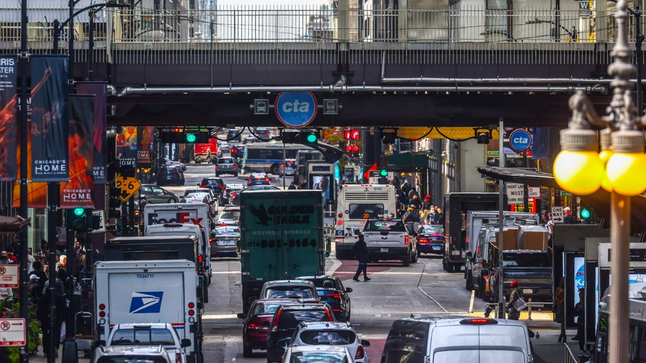 Traffic jam in downtown Chicago, Illinois, United States, on October 14, 2022. (Photo by Beata Zawrzel/NurPhoto via Getty Images)