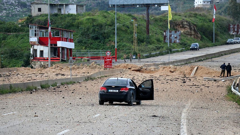 Two men stand gazing into the crater the day after an Israeli airstrike targeted the Qasmiyeh Bridge, located on a main highway linking villages in the Tyre district with others farther north, after Israel said the bridge was being used by Hezbollah,